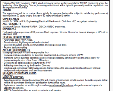 Pakistan WAPDA Foundation (PWF), which manages various welfare projects for WAPDA employees under the leadership of the Managing Director, is seeking an individual with a dynamic personality and the capability to run the organization efficiently
