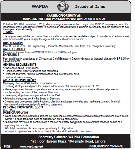 CAREER OPPORTUNITY AS MANAGING DIRECTOR, PAKISTAN WAPDA FOUNDATION IN BPS-20